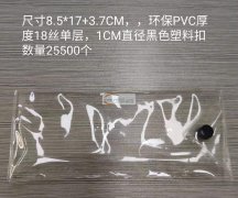 环保新料PVC高频袋子数量:25500个尺寸:8.5*17+3.7cm,厚度18丝(单层),1cm直径的黑色塑料扣,要求全环保料无印刷现金