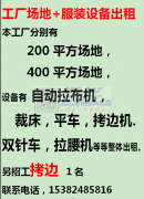 工厂场地+服装设备出租本工厂分别有200平方场地400平方场地设备有,自动拉布机裁床,平车,拷边机。双针车,拉腰机,