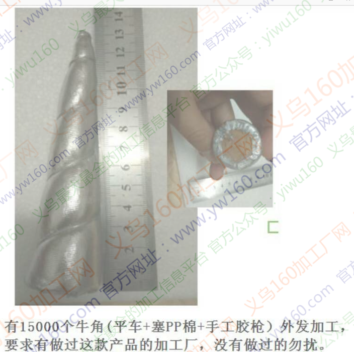 看图,有15000个牛角外发加工,平车+塞PP棉+手工胶枪,要求做过这款的加工厂,有做过的电话联系,没有做过勿扰!