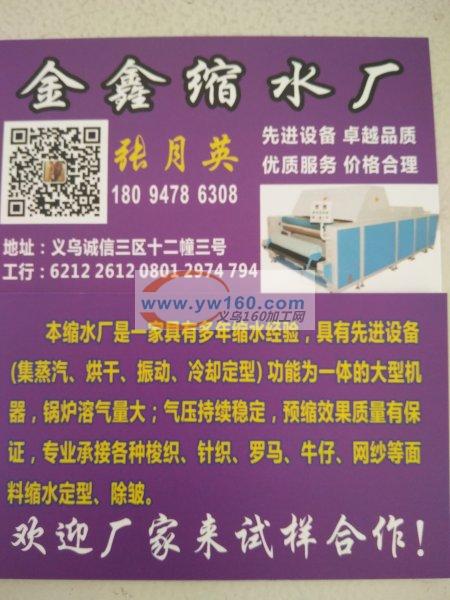 义乌金鑫面缩料缩水厂是一家具有先进设备(集蒸气、烘干、振动、冷确定型)功能为一体的机器。锅炉溶气量大,气压持续稳定,预缩效果质量有保证。专业对外承接各种梭织、针织、罗马、网纱、花边等面料缩水定型,除皱。欢迎厂家前来试样合作!!