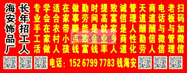 海安饰品服装厂。专业手工加工。弯九字针,挂圈,打平结,串珠子,针线活,点钻。项链,手链,耳环。本人另外有平车50台,下料采布也可以承接。承接服装加工。诚信为本。信誉第一。欢迎饰品服装外贸公司洽谈合作共赢。