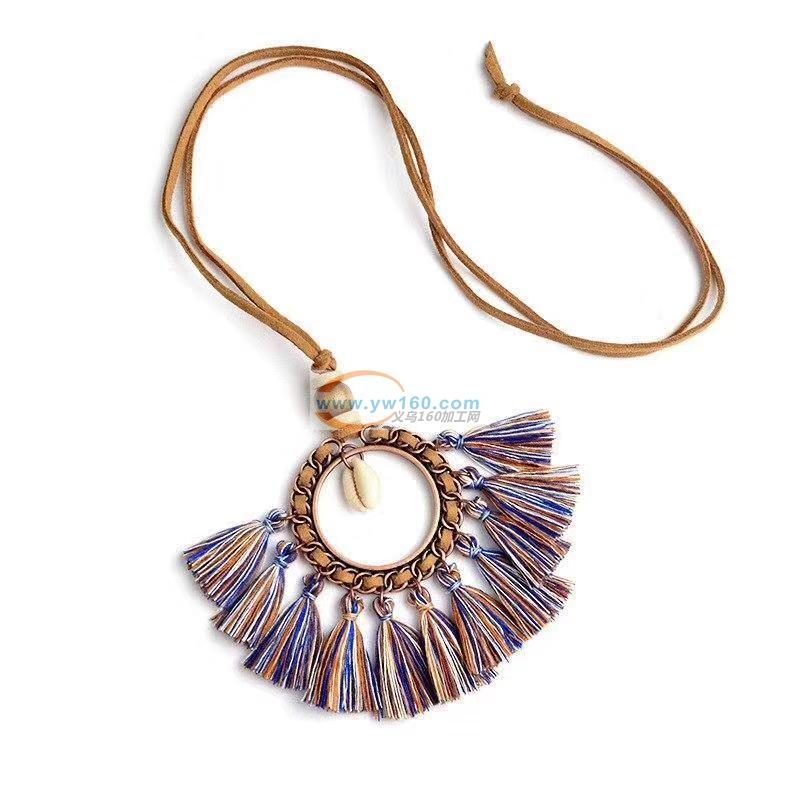 材质:锌合金,聚酯或尼龙刷,人造革(PVC皮革或PU皮革),塑料 项链采用人造绒面革蕾丝(绳子) 项链尺寸70cm 圆环尺寸8.6cm 流苏尺寸5.5cm 流苏颜色 棕色,白色,蓝色,黑色,包装:固定在下图纸卡 单个opp 5*6cm不干胶标签 一色印刷