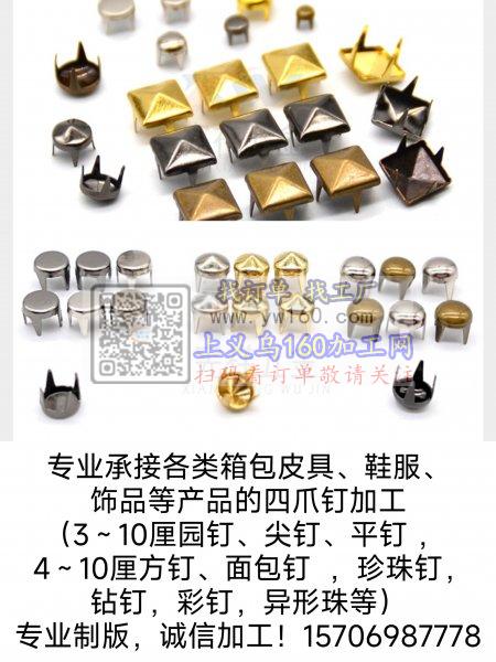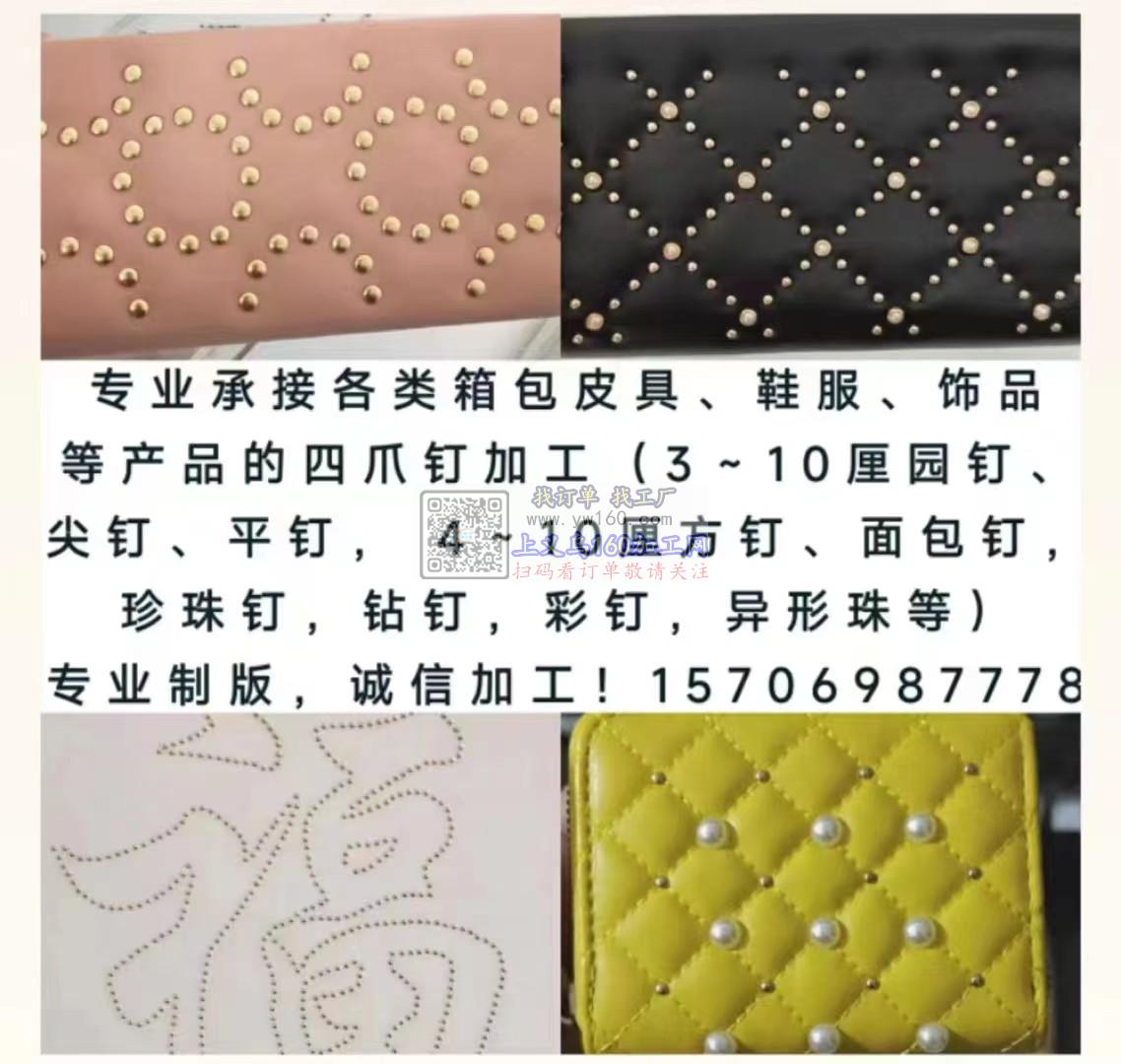 专业承接各类箱包皮具、鞋服、饰品等产品的四爪钉加工(3~10厘园钉、尖钉、平钉 , 4~10厘方钉、面包钉 ,珍珠钉,钻钉,彩钉,异形珠等)专业制版,诚信加工!
