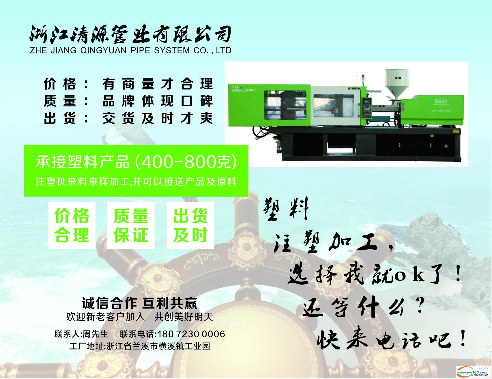 本厂浙江清源管业有限公司,地址兰溪市横溪镇工业园区,现因业务壮大, 向社会承接各类塑料注塑来料来样加工业务,不求利润回报,只求推广本厂社会人气,诚信合作,质量保证,价格绝对公道合理,欢迎各位客户来电咨询,期待与您的合作!!