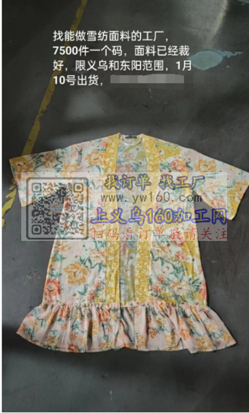 找能做雪纺面料的工厂,7500件一个码,面料已裁好,限义乌和东阳范围内,1月10号出货