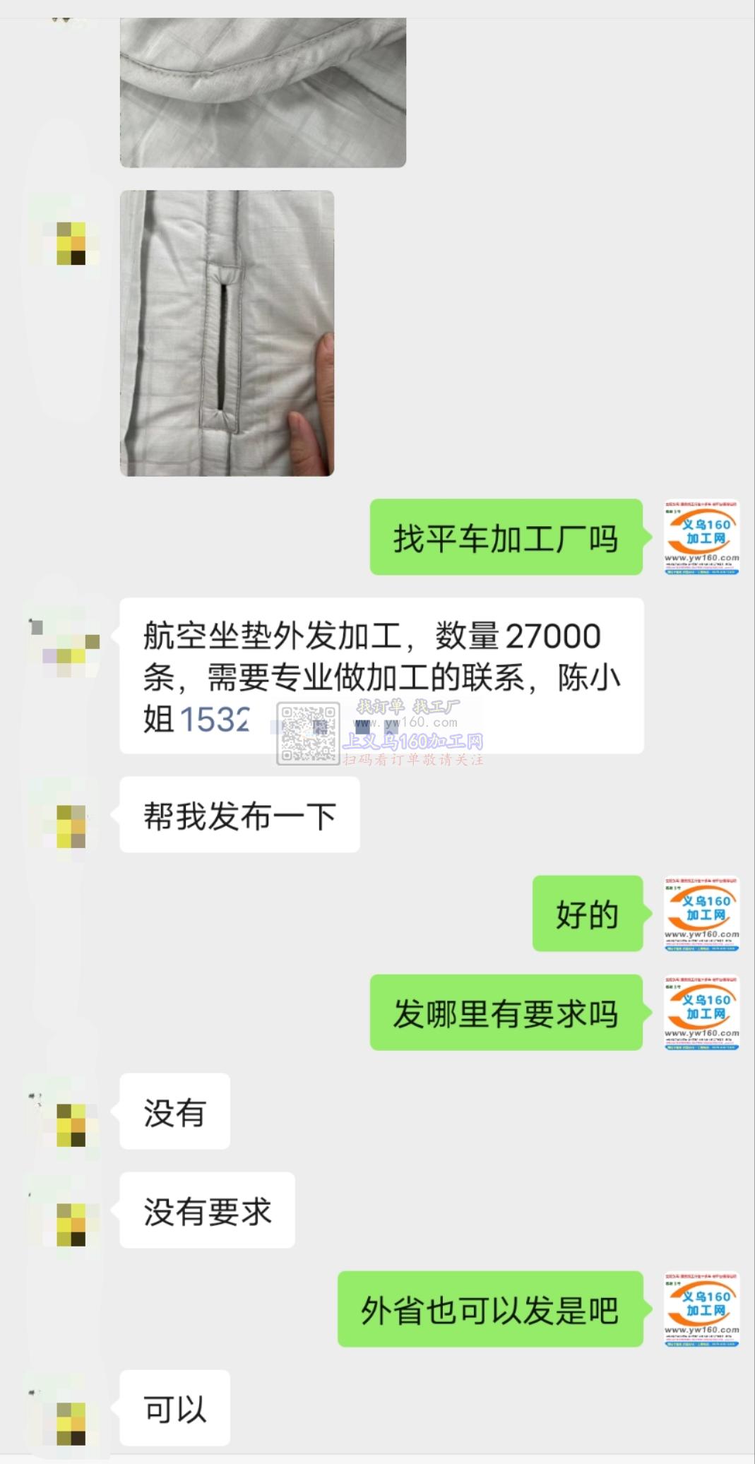 【发外地】航空坐垫外发加工,数量27000条,发哪里不限地区,可以发外地,但是需要专业做加工合作。联系陈小姐