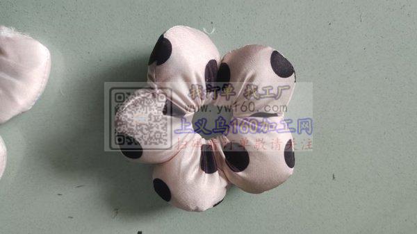 找手工加工厂,长条翻出来,里面放根皮筋,再手工塞棉,头尾手缝起来一朵花,