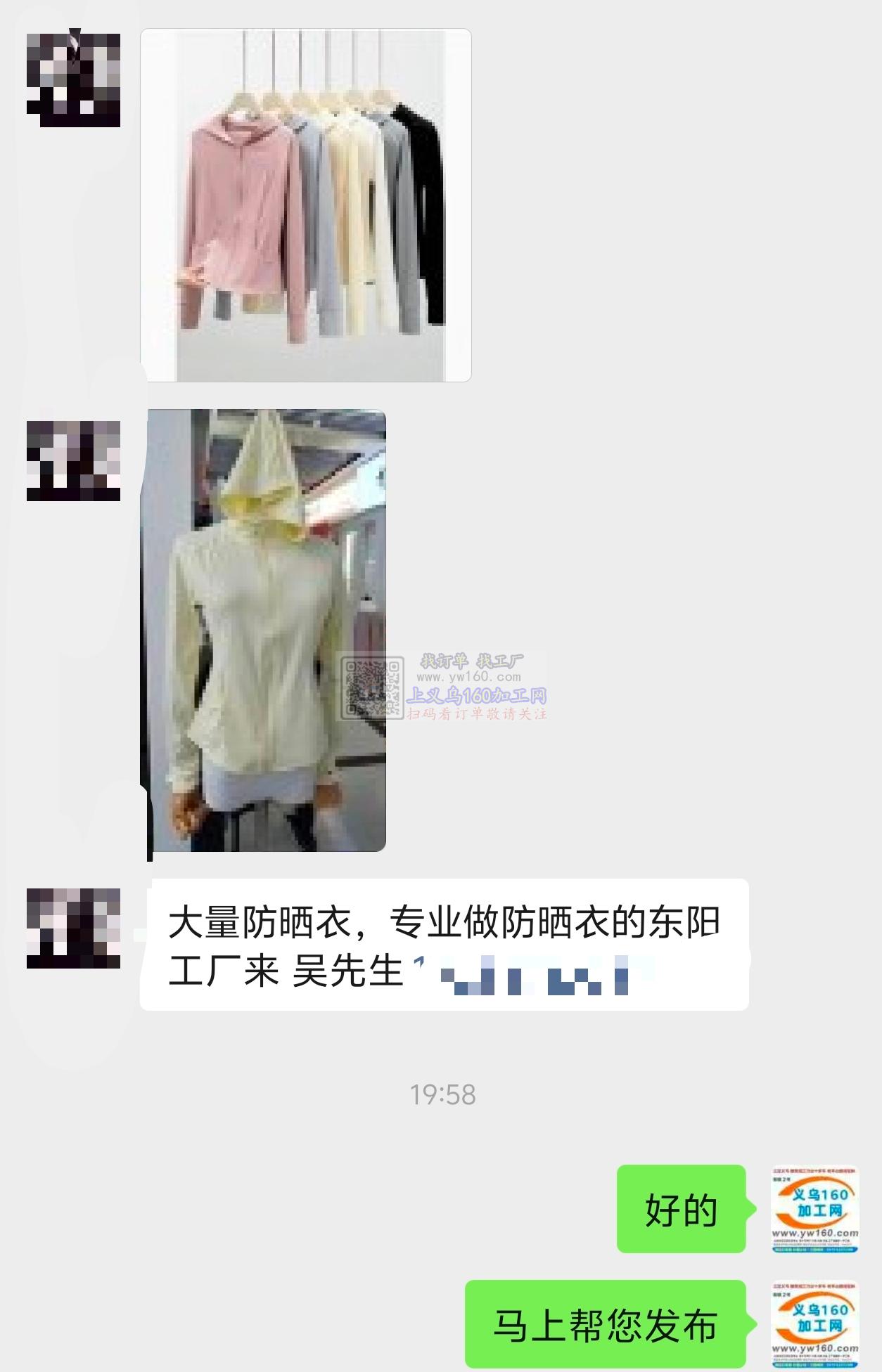 大量防晒衣外发《老板在线寻找加工厂》,寻专业做防晒衣的工厂,东阳附近的请联系。吴先生